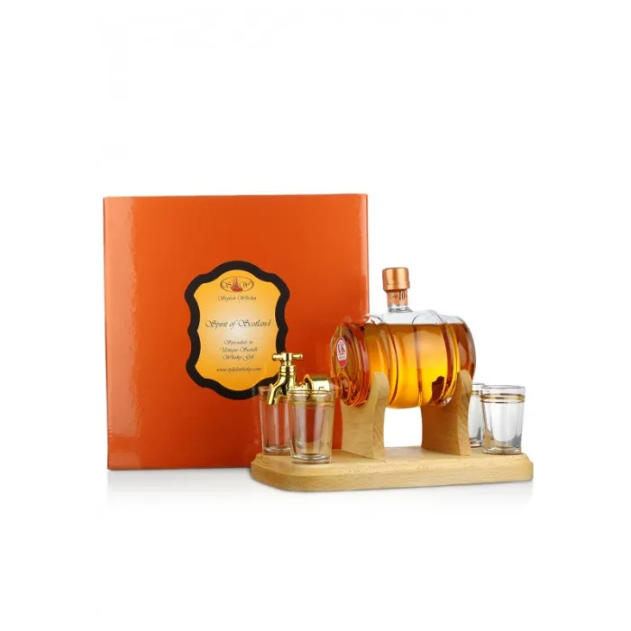 ‘This is a Barrel shape bottle with a working tap, wooden stand and two glasses. Filled with 350 ml of Highland Malt Whisky.Once the whisky is gone simply refill with your favourite tipple!Please note: image is for illustration purposes only – this product comes with two glasses.’